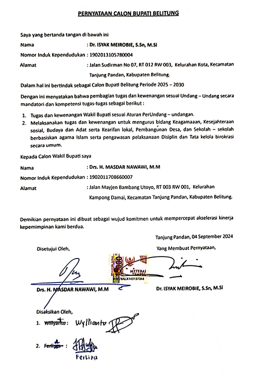 Pernyataan Calon Bupati Belitung Isyak Meirobie tersebut dibuat di Tanjungpandan pada tanggal 04 September 2024. Pernyataan dalam bentuk kesepakatan antara Isyak Meirobie selaku Calon Bupati Belitung dengan Masdar Nawawi selaku Calon Wakil Bupati Belitung tersebut, ditandatangani kedua belah pihak di atas materai bernilai 10.000.